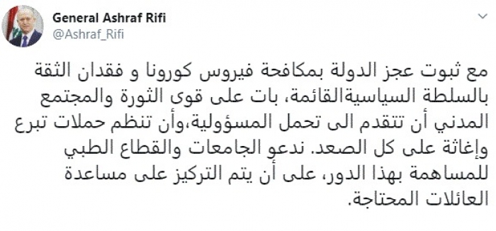وقال في تغريدة عبر "تويتر" رصدها "المشهد العربي": "مع ثبوت عجز الدولة بمكافحة فيروس كورونا وفقدان الثقة بالسلطة السياسية القائمة، بات على قوى الثورة والمجتمع المدني أن تتقدم الى تحمل المسؤولية، وأن تنظم حملات تبرع وإغاثة على كل الصعد".