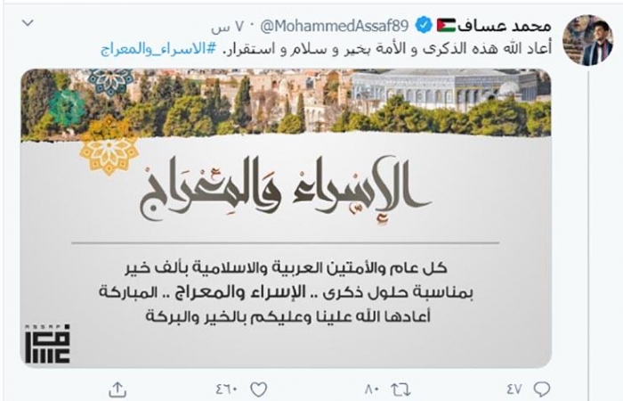 هنأ الفنان الفلسطيني محمد عساف، عبر حسابه الرسمي بموقع تويتر، جمهوره بمناسبة ليلة الإسراء والمعراج.