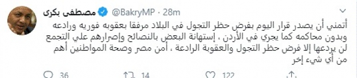 وأضاف: "استهانة البعض بالنصائح وإصرارهم علي التجمع لن يردعها إلا فرض حظر التجول والعقوبة الرادعة، أمن مصر وصحة المواطنين أهم من أي شيء آخر".