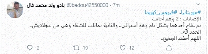وقال في تغريدة عبر "تويتر" رصدها "المشهد العربي": "موريتانيا.. فيروس كورونا الإصابات : 2 وهم أجانب تم علاج أحدهما بشكل تام وهو استرالي.. والثانية تماثلت للشفاء وهي من بنجلاديش.. الحمد لله.. اللهم أحفظ الجميع".