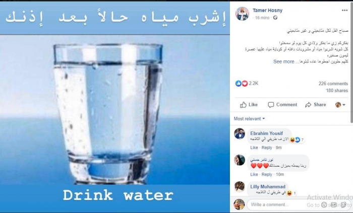 وأضاف تامر "كل شوية نشرب مياه مقولتش برميل مياه بقول شوية مياه، ونفكر بعض كل يوم ان شاء الله اول ما نصحى وقبل ما ننام ضروري وحياة أحبابكم. نفكر بعض ونثبت الرسالة دي أو غيرها على الواتساب والسوشيال ميديا (اشرب مياه حالاً بعد اذنك)، نبعتها لبعض كل يوم في أي وقت ملهاش مواعيد في حفظ الله".