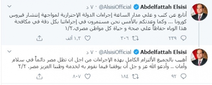 وكتب السيسي عبر تغريدة له على "تويتر" رصدها " المشهد العربي":"أتابع عن كثب و على مدار الساعة إجراءات الدولة الاحترازية لمواجهة انتشار فيروس كورونا".