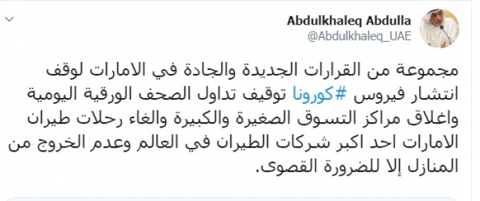 وكتب عبد الله عبر تغريدة له على "تويتر" رصدها " المشهد العربي":"مجموعة من القرارات الجديدة والجادة في الإمارات لوقف انتشار فيروس كورونا".
