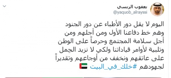 أشاد الكاتب الإماراتي يعقوب الريسي، اليوم الإثنين ، بجهود الأطباء الإماراتيين في مواجهة أزمة كورونا.
