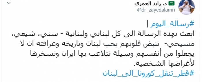 وكتب العمري عبر تغريدة له على "تويتر" رصدها " المشهد العربي":"ابعث بهذه الرسالة إلى كل لبناني ولبنانية - سني، شيعي، مسيحي- تنبض قلوبهم بحب لبنان وتاريخه وعراقته أن لا يجعلوا من أنفسهم وسيلة تتلاعب بها إيران وتسخرها لأغراضها الشخصية".