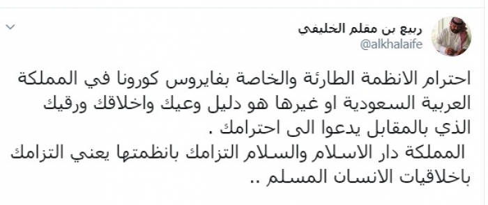 وكتب الخليفي عبر تغريدة له على "تويتر" رصدها " المشهد العربي":"احترام الأنظمة الطارئة والخاصة بفيروس كورونا في المملكة العربية السعودية أو غيرها هو دليل وعيك وأخلاقك ورقيك الذي بالمقابل يدعوا إلى احترامك" .