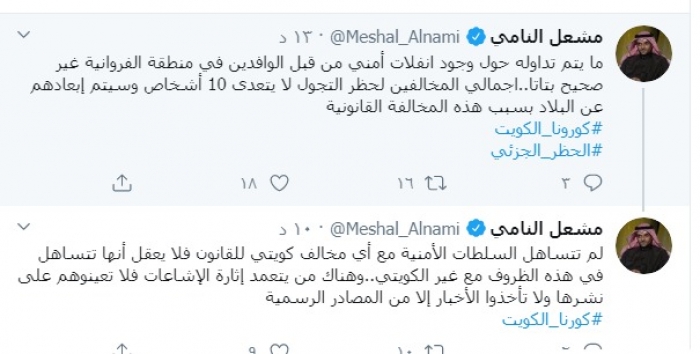 وكتب النامي عبر تغريدة له على "تويتر" رصدها " المشهد العربي":"ما يتم تداوله حول وجود انفلات أمني من قبل الوافدين في منطقة الفروانية غير صحيح بتاتا،إجمالي المخالفين لحظر التجول لا يتعدى 10 أشخاص وسيتم إبعادهم عن البلاد بسبب هذه المخالفة القانونية".