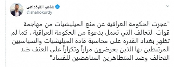 انتقد الكاتب الصحفي العراقي شاهو القرةداغي، اليوم، الحكومة العراقية وذلك جراء عجزها عن منع المليشيات من مهاجمة قوات التحالف الدولي.