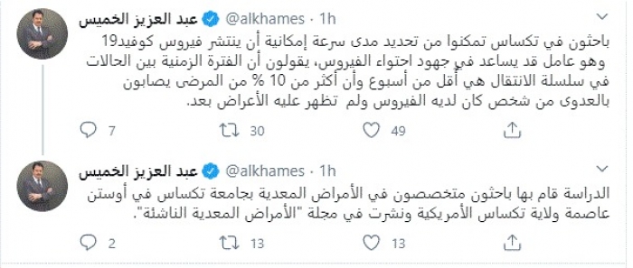 وقال في تغريدات عبر "تويتر" رصدها "المشهد العربي": "باحثون في تكساس تمكنوا من تحديد مدى سرعة إمكانية أن ينتشر فيروس كوفيد19 وهو عامل قد يساعد في جهود احتواء الفيروس، يقولون أن الفترة الزمنية بين الحالات في سلسلة الانتقال هي أٌقل من أسبوع وأن أكثر من 10 % من المرضى يصابون بالعدوى من شخص كان لديه الفيروس ولم تظهر عليه الأعراض بعد".