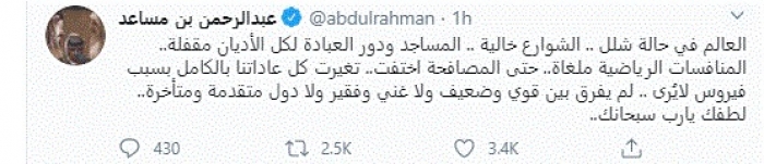 وكتب في تغريدة عبر "تويتر" رصدها "المشهد العربي": "العالم في حالة شلل.. الشوارع خالية.. المساجد ودور العبادة لكل الأديان مقفلة.. المنافسات الرياضية ملغاة.. حتى المصافحة اختفت".