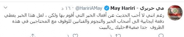 علقت الفنانة اللبنانية مي حريري، عبر حسابها الرسمي بموقع تويتر، على أعمال الخير التي يعلن عنها عدد من الفنانين.
