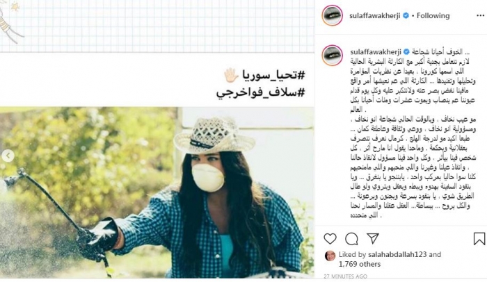 وجهت النجمة السورية سولاف فواخرجي رسالة لجمهورها ومتابعيها لضرورة التعامل بجدية وحذر فى أزمة تفشى فيروس كورونا الحالية التي ضربت عدد كبير من دول العالم، قائلة عبر حسابها بموقع "انستجرام" :"لازم نتعامل بجدية أكبر مع الكارثة البشرية الحالية كورونا، بعيدا عن نظريات المؤامرة وتحليلها وتفنيدها".