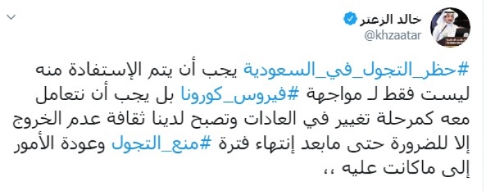 وكتب الزعتر عبر تغريدة له على "تويتر " رصدها " المشهد العربي" :"حظر التجول في السعودية يجب أن يتم الاستفادة منه ليس فقط لمواجهة فيروس كورونا بل يجب أن نتعامل معه كمرحلة تغيير في العادات".