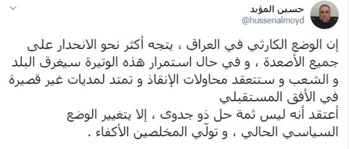 وكتب المؤيد عبر تغريدة له على "تويتر" رصدها " المشهد العربي":"إن الوضع الكارثي في العراق ، يتجه أكثر نحو الانحدار على جميع الأصعدة ، و في حال استمرار هذه الوتيرة سيغرق البلد و الشعب و ستتعقد محاولات الإنقاذ و تمتد لمديات غير قصيرة في الأفق المستقبلي".