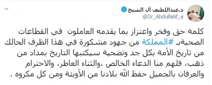 وكتب آل الشيخ عبر تغريدة له على "تويتر" رصدها " المشهد العربي":"كلمة حق وفخر واعتزاز بما يقدمه العاملون في القطاعات الصحية بالمملكة من جهود مشكورة في هذا الظرف الحالك من تاريخ الأمة بكل جد وتضحية سيكتبها التاريخ بمداد من ذهب".