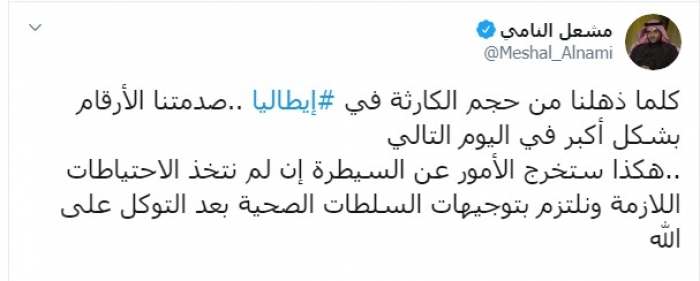 وكتب النامي عبر تغريدة له على "تويتر" رصدها " المشهد العربي":"كلما ذهلنا من حجم الكارثة في إيطاليا،صدمتنا الأرقام بشكل أكبر في اليوم التالي".