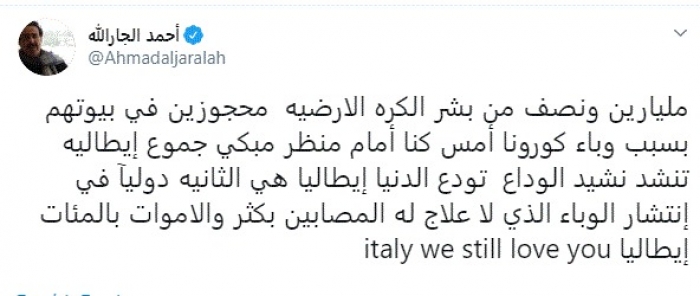 وكتب في تغريدة عبر "تويتر" رصدها "المشهد العربي": "مليارين ونصف من بشر الكرة الأرضية محجوزين في بيوتهم بسبب وباء كورونا أمس كنا أمام منظر مبكي جموع إيطالية تنشد نشيد الوداع تودع الدنيا إيطاليا هي الثانية دوليآ في انتشار الوباء الذي لا علاج له المصابين بكثر والأموات بالمئات إيطالياitaly we still love you".