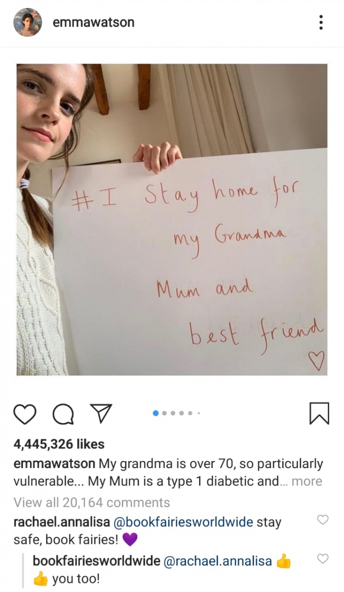 وكتبت إيما: "جدتي عمرها فوق الـ 70، أمي مريضة بمرض السكر، أفضل أصدقائي أخصائي رعاية صحية، أنا سأبقى في المنزل من أجلهم جميعاً، من أجل من ستبقى أنت؟"