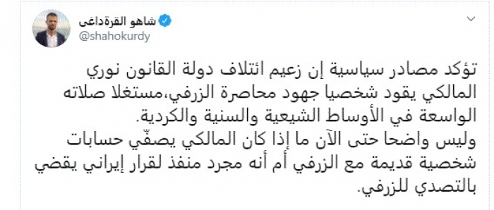 وكتب في تغريدة عبر "تويتر" رصدها "المشد العربي": "تؤكد مصادر سياسية إن زعيم ائتلاف دولة القانون نوري المالكي يقود شخصيًا جهود محاصرة الزرفي، مستغلا صلاته الواسعة في الأوساط الشيعية والسنية والكردية".