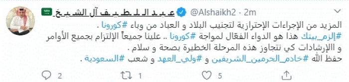 وأضاف: "إلزم بيتك هذا هو الدواء الفعّال لمواجهة كورونا .. علينا جميعاً الالتزام بجميع الأوامر والإرشادات كي نتجاوز هذه المرحلة الخطيرة بصحة و سلام. حفظ الله خادم الحرمين الشريفين وولي العهد وشعب السعودية".