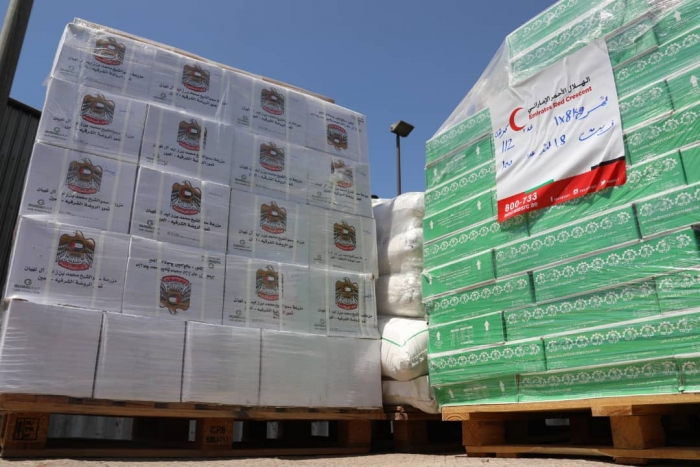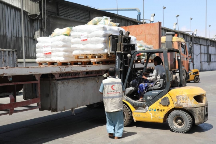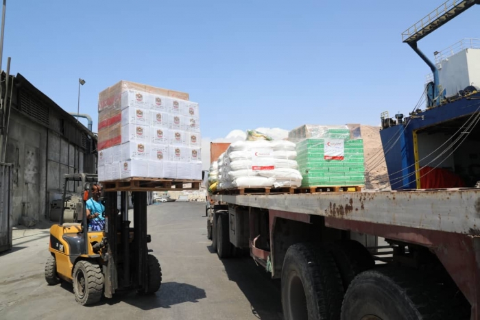 تمهيداً لتوزيعها.. تفريغ حمولة سفينة المساعدات الإماراتية بالمكلا