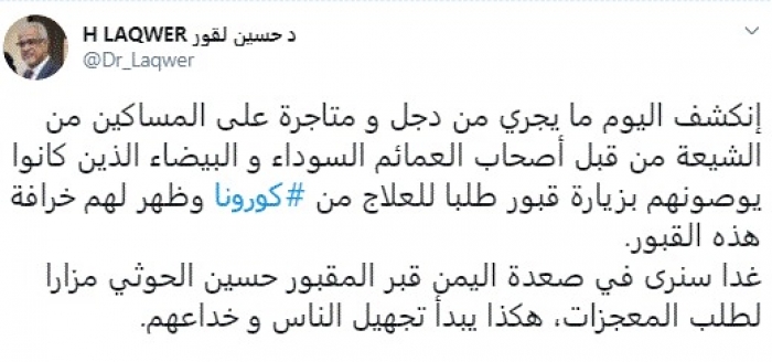 وقال في تغريدة عبر "تويتر" رصدها "المشهد العربي": "انكشف اليوم ما يجري من دجل و متاجرة على المساكين من الشيعة من قبل أصحاب العمائم السوداء والبيضاء الذين كانوا يوصونهم بزيارة قبور طلبا للعلاج من كورونا وظهر لهم خرافة هذه القبور".