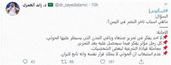 وقال في تغريدة عبر "تويتر" رصدها "المشهد العربي": "السؤال : ما هو أسباب تأخر النصر في اليمن؟— الإجابة: لا أحد يفكر في تحرير صنعاء وباقي المدن التي يسيطر عليها الحوثي".