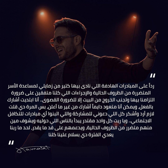 ونشر حماقي منشورًا، عبر حسابه الرسمي بموقع "إنستجرام" قال فيه: "ردًا على المبادرات الهادفة اللي نادى بيها كتير من زمايلي لمساعدة الأسر المتضررة من الظروف الحالية والإجراءات اللي كلنا متفقين على ضرورة التزامنا بيها، وتجنب الخروج من البيت إلا للضرورة القصوى".
