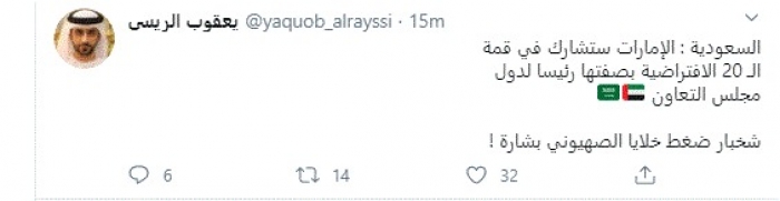 وقال في تغريدة عبر "تويتر" رصدها "المشهد العربي": " السعودية: الإمارات ستشارك في قمة الـ 20 الافتراضية بصفتها رئيسا لدول مجلس التعاون شخبار ضغط خلايا الصهيوني بشارة".