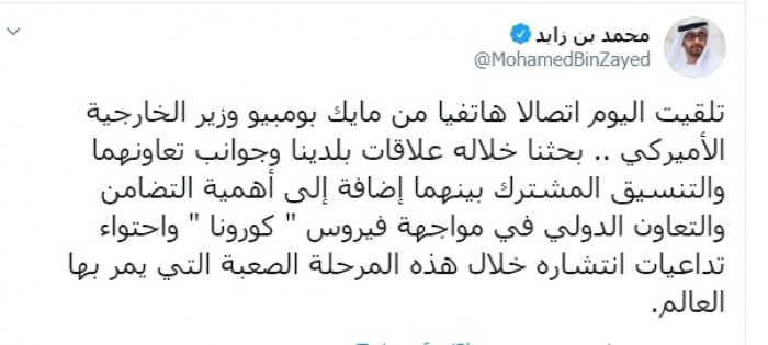 وكتب بن زايد عبر تغريدة له على "تويتر" رصدها " المشهد العربي":"تلقيت اليوم اتصالا هاتفيا من مايك بومبيو وزير الخارجية الأميركي".