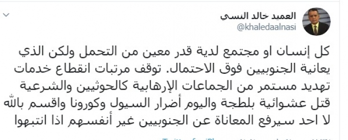 وكتب النسي عبر تغريدة له على "تويتر" رصدها " المشهد العربي":"كل إنسان أو مجتمع لدية قدر معين من التحمل ولكن الذي يعانيه الجنوبيين فوق الاحتمال".