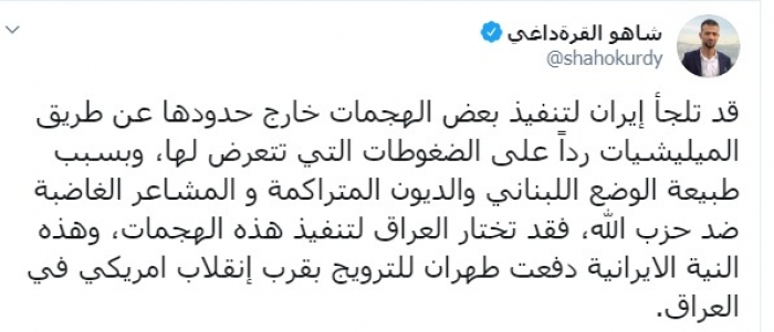 توقع الكاتب الصحفي العراقي شاهو القرة داغي، اليوم، أن تشن إيران بعض الهجمات خارج حدودها عن طريق المليشيات التابعة لها.