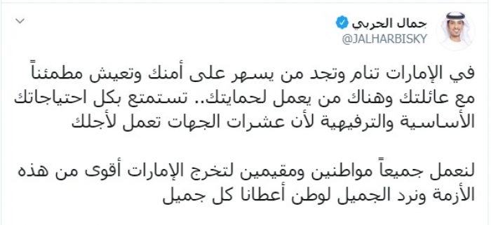وكتب الحربي عبر تغريدة له على "تويتر" رصدها " المشهد العربي":"في الإمارات تنام وتجد من يسهر على أمنك وتعيش مطمئناً مع عائلتك وهناك من يعمل لحمايتك، تستمتع بكل احتياجاتك الأساسية والترفيهية لأن عشرات الجهات تعمل لأجلك".