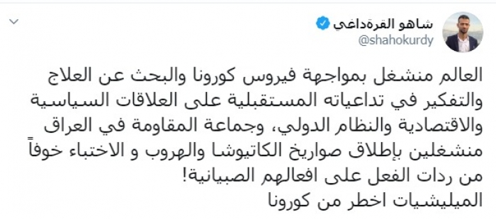 أكد الكاتب الصحفي العراقي شاهو القرة داغي، اليوم الخميس، أن المليشيات أخطر من فيروس كورونا.