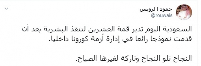 وكتب الرويس عبر تغريدة له على "تويتر" رصدها " المشهد العربي":" السعودية اليوم تدير قمة العشرين لتنقذ البشرية بعد أن قدمت نموذجا رائعا في إدارة أزمة كورونا داخليا".