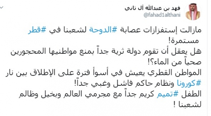 وتابع :"المواطن القطري يعيش في أسوأ فترة على الإطلاق بين نار كورونا ونظام حاكم فاشل وغبي جداً"، الطفل تميم كريم جداً مع مجرمي العالم وبخيل وظالم لشعبنا" !