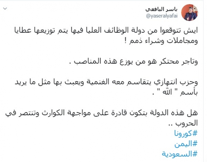 وتساءل اليافعي عبر تغريدة له على " تويتر" رصدها " المشهد العربي":" ماذا تتوقعوا من دولة الوظائف العليا فيها يتم توزيعها عطايا ومجاملات وشراء ذمم ، وتاجر محتكر هو من يوزع هذه المناصب" .