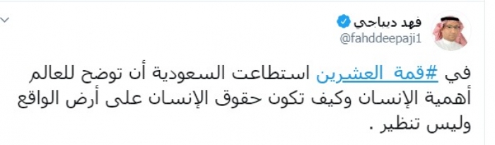 وكتب ديباجي عبر تغريدة له على "تويتر" رصدها " المشهد العربي":" قمة العشرين استطاعت السعودية أن توضح للعالم أهمية الإنسان وكيف تكون حقوق الإنسان على أرض الواقع وليس تنظير" .
