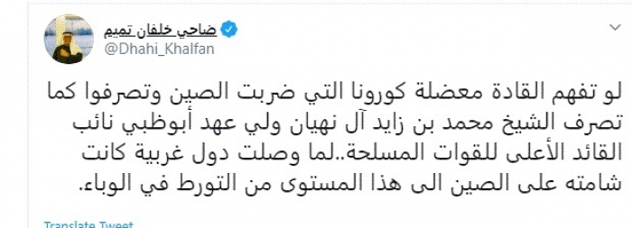 وقال في تغريدة عبر "تويتر" رصدها "المشهد العربي": "لو تفهم القادة معضلة كورونا التي ضربت الصين وتصرفوا كما تصرف الشيخ محمد بن زايد آل نهيان ولي عهد أبوظبي نائب القائد الأعلى للقوات المسلحة..لما وصلت دول غربية كانت شامته على الصين الى هذا المستوى من التورط في الوباء".