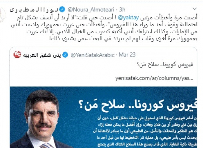 شنت الكاتبة والباحثة نورا المطيري، اليوم، هجومًا حادًا على مستشار الرئيس التركي رجب طيب أردوغان ياسين أقطاي، وذلك جراء بثه للشائعات عن الإمارات العربية المتحدة.