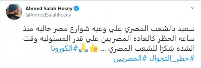 وكتب صلاح حسني، عبر حسابه على "تويتر"، قائلا : "سعيد بالشعب المصري على وعيه.. شوارع مصر خالية منذ ساعة الحظر.. كالعادة المصريين على قدر المسؤولية وقت الشدة، شكرًا للشعب المصري".