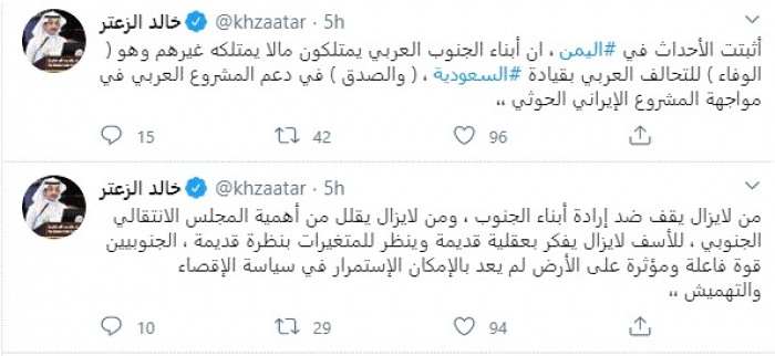 وكتب في تغريدات عبر "تويتر" رصدها "المشهد العربي": "أثبتت الأحداث في اليمن، أن أبناء الجنوب العربي يمتلكون ما لا يمتلكه غيرهم وهو (الوفاء) للتحالف العربي بقيادة السعودية، (والصدق) في دعم المشروع العربي في مواجهة المشروع الإيراني الحوثي".