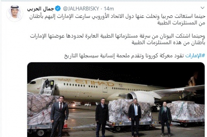 وقال في تغريدة عبر "تويتر" رصدها "المشهد العربي": "حينما استغاثت صربيا وتخلت عنها دول الاتحاد الأوروبي سارعت الإمارات إليهم بأطنان من المستلزمات الطبية".