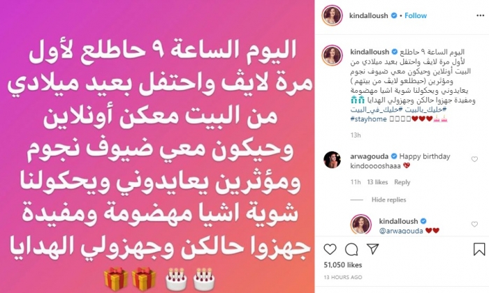 وأعلنت "كندة"، من خلال حسابها بـ"انستجرام"، عن طريقة احتفالها، وقالت: "اليوم الساعة 9، هاطلع لأول مرة لايف، واحتفل بعيد ميلادي من البيت معكن أونلاين".