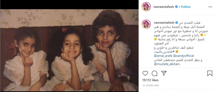 ونشرت نسرين، صورتها مع شقيقاتها في الطفولة عبر حسابها على "انستجرام"، وعلقت: "قبلت التحدي من النجمة أمل عرفة والنجمة ساندي، وهي صورتي أنا وصغيرة مع نور عيوني أخواتي رانيا وياسمين".
