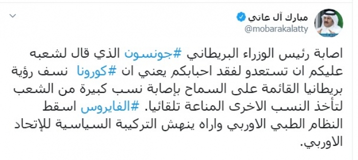 وكتب في تغريدة له على "تويتر" رصدها " المشهد العربي":" إصابة رئيس الوزراء البريطاني جونسون الذي قال لشعبه عليكم أن تستعدوا لفقد أحبابكم يعني إن كورونا نسف رؤية بريطانيا القائمة على السماح بإصابة نسب كبيرة من الشعب لتأخذ النسب الأخرى المناعة تلقائيا.