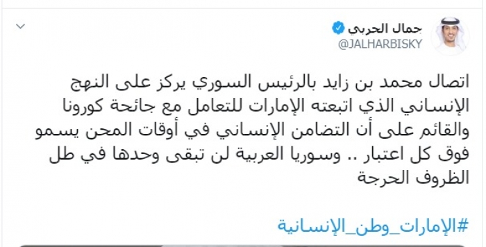 وكتب في تغريدة له عبر "تويتر" رصدها " المشهد العربي":"اتصال محمد بن زايد بالرئيس السوري يركز على النهج الإنساني الذي اتبعته الإمارات للتعامل مع جائحة كورونا والقائم على أن التضامن الإنساني في أوقات المحن يسمو فوق كل اعتبار".
