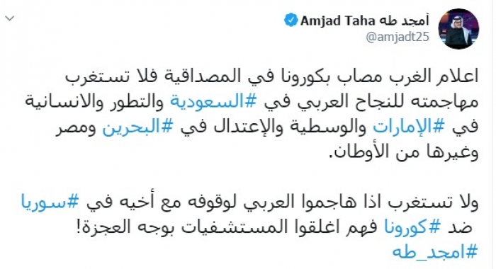 وكتب طه عبر تغريدة له على "تويتر" رصدها " المشهد العربي" :"إعلام الغرب مصاب بكورونا في المصداقية فلا تستغرب مهاجمته للنجاح العربي في السعودية والتطور والإنسانية في الإمارات والوسطية والاعتدال في البحرين ومصر وغيرها من الأوطان".