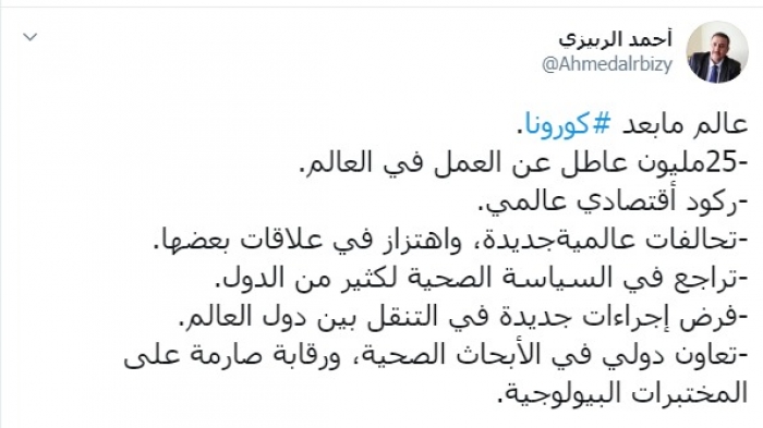 وكتب الربيزي عبر تغريدة له على "تويتر" رصدها " المشهد العربي":"عالم مابعد كورونا، 25مليون عاطل عن العمل في العالم، وركود اقتصادي عالمي، وتحالفات عالمية جديدة، واهتزاز في علاقات بعضها".