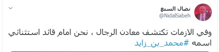 وكتب السبع عبر تغريدة له على" تويتر" رصدها" المشهد العربي":" وفي الأزمات تكتشف معادن الرجال ، نحن أمام قائد استثنائي اسمه محمد بن زايد".